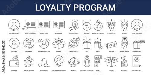 client, loyalty, program, icon, set, collection, illustration, vector, information, icon, set, infographic, definition, simple, business, management, strategy, presentation, pictogram, design, symbol, background, line, outline, linear, template, web, editable, colours, website, industry, industrial, development, element, type, member, membership, discount, offer, special, vip, service, point, merchandise, human relationships, attraction, gift, bonus, reward
