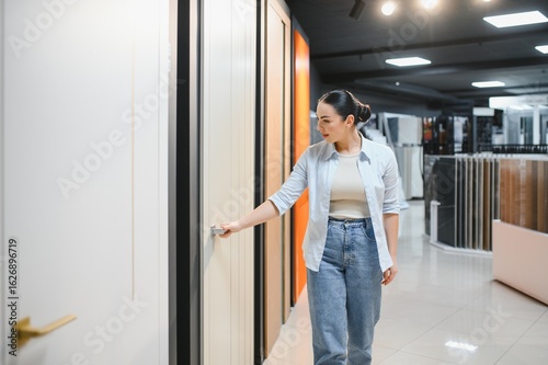 door, store, hardware, interior, design, client, woman, choosing, opening, quality, convenience, retail, shop, showroom, home, improvement, renovation, construction, building, architecture, house, apartment, bricolage, sale, purchase, buying, shopping, selection, decision, product, display, furniture, decor, style, element, browse, wood, laminate, metal, glasses, handle, lock, hinge, frame, installation, new, property, real, estate