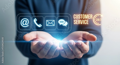 Customer service icons, including email, phone, chat, and at symbol, hover over open hands, representing support and communication channels