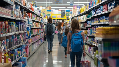 Customers browsing aisles in a stationery store filled with school supplies and office essentials.