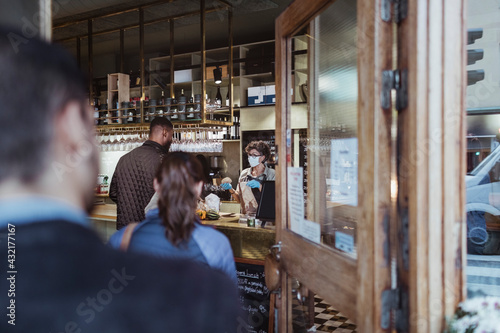 Customers maintaining social distancing while collecting order from deli store during pandemic