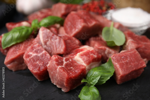 Cut fresh beef meat and basil leaves on slate plate, closeup