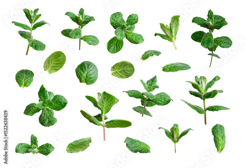 Cut out mint. Collection of green fresh mint, peppermint, lemon balm, melissa leaves isolated on white background. With clipping path. Leaves for design, mockup. Plant for medicine, cosmetics, tea