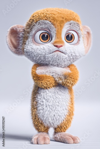 Cute 3d cartoon monkey character with fluffy fur and large expressive eyes, child-friendly design