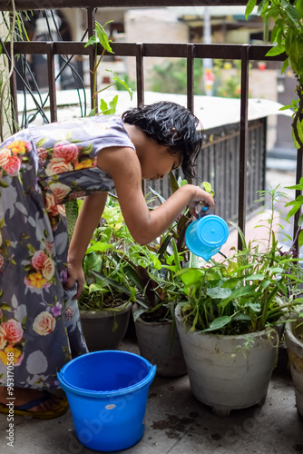 Cute 5 year old Asian little girl is watering the plant in the pots located at house balcony, Love of sweet little girl for the mother nature during watering into plants, Kid Planting