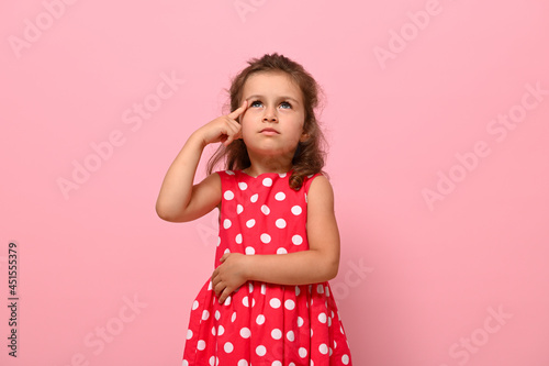 Cute adorable preschool girl, 3-4 years old, looks thoughtfully up, holding her finger to her temple, posing on a pink background with copy space. Portrait of a pensive baby girl