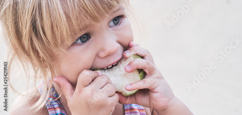 Cute adorable toddler girl eating fresh pear sitting on the beach.