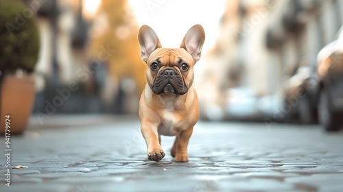 Cute and Confident French Bulldog Casually Walking Down a Bustling City Street with Ample Copy Space for Text or Graphic Overlay