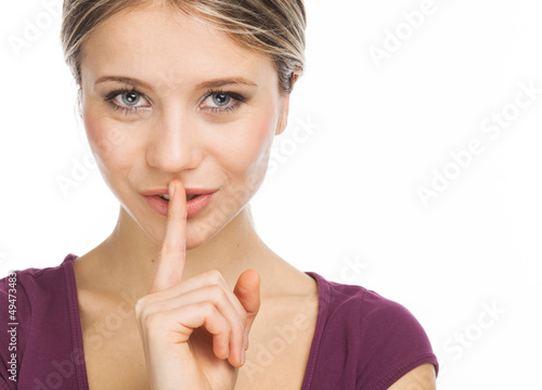 hush, hushed, shh, woman, secret, seduction, silence, mysterious, mute, muted, blond, young, beautiful, smile, smiling, finger, mouth, lip, gesture, quiet, expression, beauty, girl, face, charming, people, person, female, portrait, emotion, pretty, adult, sexy, sensual, attractive, 1, caucasian, cute, studio, isolated, white, background, model