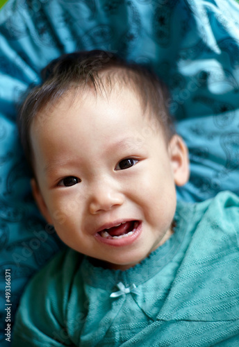 Cute asian kid playing on the bed