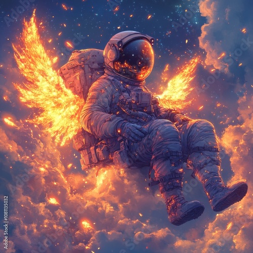 astronaut, angel wings, space, flying, celestial, fantasy, whimsical, angelic, aethereal, glowing, starry sky, dreamlike, fantasy art
