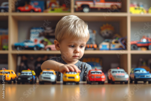 Cute baby boy building cars in row on the floor and playing with them. Stereotypical alignment of objects is a sign of autism. child leisure and pastime. childhood