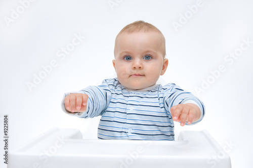 adorable, baby, baby, beautiful, boy, boy, children, childhood, children, cute, growing, innocence, innocent, children, children, little, small, sweet, high chair, making faces, expression, expressive, face, face, facial, portrait, to sit, sitting, blue, caucasian, eye, isolated, striped, stripes, white, cheerful, happiness, happy, joy, smile, smiling