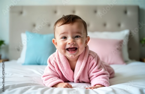 baby, boy, children, toddler, infant, cute, happy, laughing, bathrobe, pink, blue, pillow, bed, room, interior, health, care, play, children, ai, photo, children, smiling, soft, clean, laundry, towel, fun, hygiene, bathing, adorable, cute baby, sweet, children, bathe, center, development, smile, beautiful, healthy, love, family, new, eltern, maternity