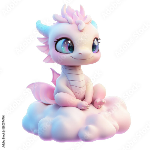 Cute baby dragon with colorful eyes sitting on a soft cloud in a magical fantasy setting