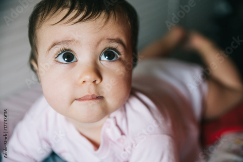 Cute baby girl portrait, lying down on nappy changing unit