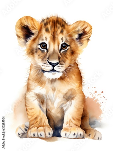 cute baby lion sitting on the ground - watercolor illustration created using generative AI tools