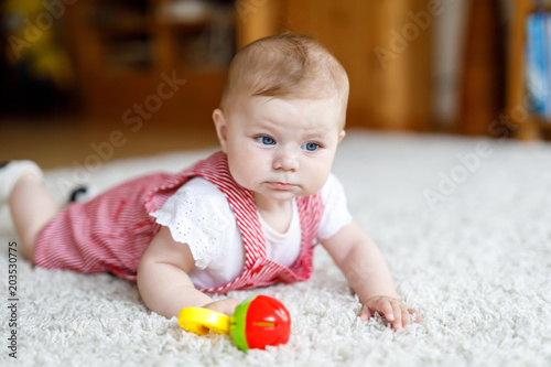 Cute baby playing with colorful rattle education toy. Lttle girl looking at the camera and crawling