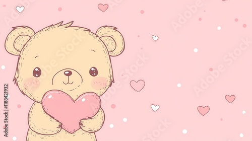 Cute Bear Holding Heart With Pink Background and Floating Hearts