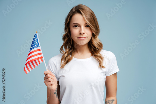 Cute, beautiful young woman, patriot, supporter with stylish hairstyle holding American flag