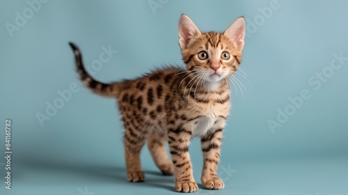 kitten, cat, bengal, felino, animal, baby animal, furry, pet, domestic, adorable, cute, young, playful, predator, curious, pose, standing, facing, studio, blue, pastel, clean, minimalist, empty, space, photogenic, portrait, wildlife, nature, mammal, carnivore, felidae, hunter, exploring, fluffy, whisker, paw, tail, eye, nose, ear, claw, indoor, studio shot, copy space