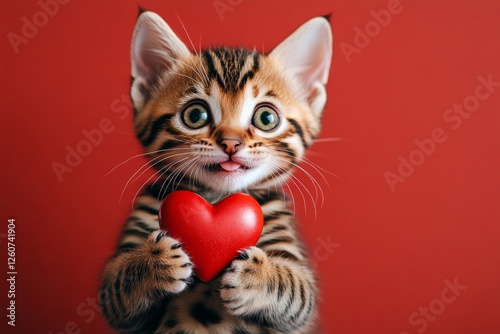Cute bengal young cat with diamond red heart - sign of love, funny greeting card. Bengal - my preferred cat. Ad campaign creative. Heart-shaped kitten photo. Cute red animal valentine.