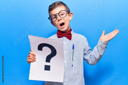 Cute blond kid wearing nerd bow tie and glasses holding question mark celebrating achievement with happy smile and winner expression with raised hand