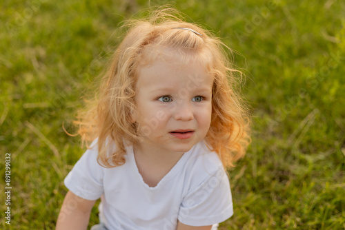 Cute blonde kid with curly hair walks on the lawn with soap bubbles in summer
