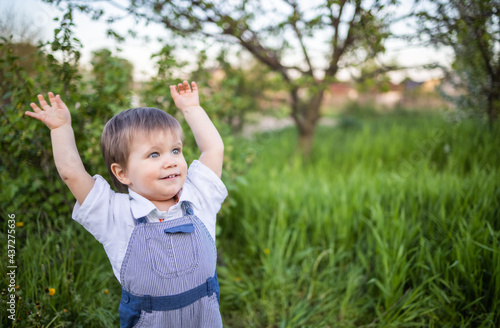 Cute boy in fashionable clothes with blue eyes plays and jumps in the tall grass in a large green blooming garden