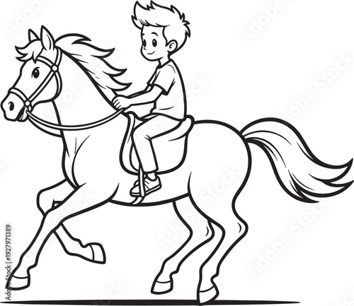 Cute boy riding horse cartoon illustration, happy child equestrian activity vector line art design
