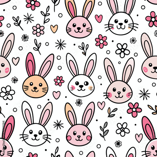 rabbit, rabbit, easter, spring, floral, pattern, seamless, cute, animal, children, children, baby, cartoon, drawing, illustration, design, pink, white, flower, heart, leaf, doodle, graphic, vector, art, print, fabric, wallpaper, background, adorable, pastel, decor, rabbit