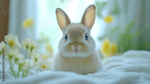 Cute bunny rabbit with big eyes and fluffy fur sits among white and yellow flowers on a white blanket.