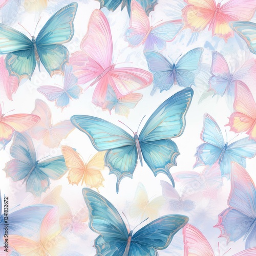 Cute butterflies hand drawn seamless pattern. Delicate colorful butterflies on white background. Beautiful pastel creatures wallpaper design.
