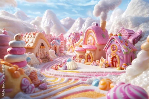 Cute candy village features candy cane roads and candy-coated homes in a dreamlike fantasy world