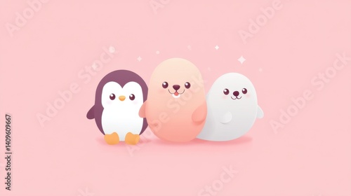 Cute cartoon animals featuring a penguin and two seals on a pastel pink background.