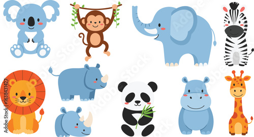 animal, cartoon, cute, vector, panda, lion, zebra, koala, giraffe, monkey, elephant, rhino, hippo, baby, wildlife