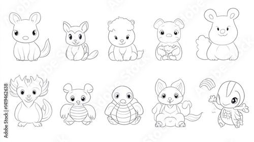 Cute cartoon animals, sitting poses, line art, children's book illustration, coloring page, education, drawing, coloring, activity