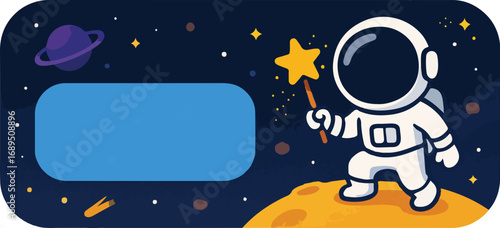 Cute cartoon astronaut on the moon holding a magic star wand in space with planets and stars, with a blue label area.