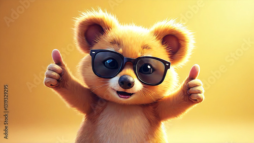 bear, cartoon, cute, sunglasses, thumb, up, approval, happy, positive, character, animal, furry, mammal, cheerful, illustration, animation, fun, friendly, adorable, agreements, ok, like, good, bright, background, gesture, hand, paw, brown, gold, fluffy, design, graphic, art, render, digital, smiling, face, head, ear, nose, eye, small, tiny, funny
