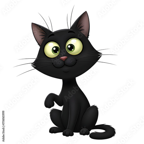 Cute cartoon black cat sitting with its paw raised, wide green eyes, happy expression, white background