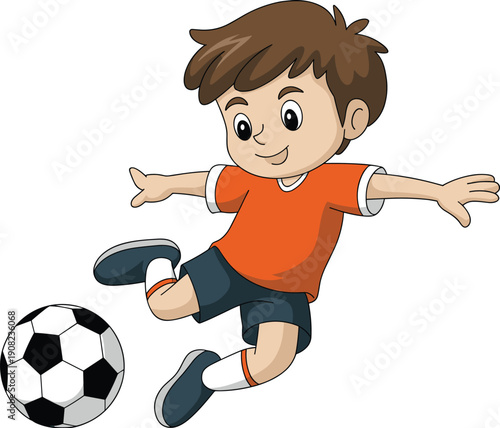 Cute cartoon boy playing soccer kicking football isolated on white background kids sport character illustration for education design