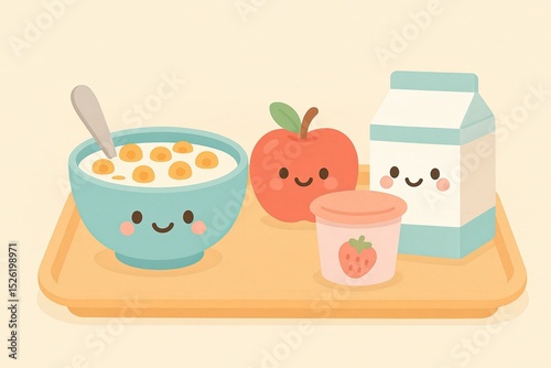 Cute cartoon breakfast tray with smiling cereal bowl, apple, yogurt and milk carton on a soft beige background. The image conveys cheerful eating habits, morning routines and child-friendly nutrition