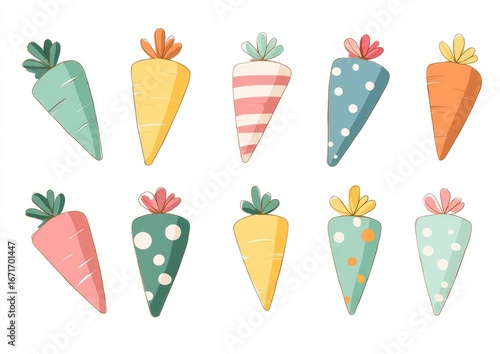 carrot, cute, cartoon, vegetable, food, colourful, pattern, design, illustration, spring, easter, orange, pink, yellow, green, blue, pastel, striped, dotted, decorative, fresh, healthy, children, children, clip art, graphic, vector, digital, art, isolated, simple, modern, flat, set, collection, patterned, element