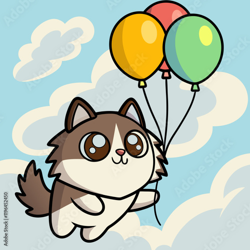 Cute cartoon cat floating with a balloon in the sky, perfect for fun, whimsical designs.