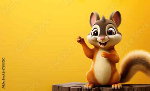 cute cartoon character happy squirrel points paw at copy space on an yellow isolated background