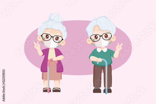 Cute cartoon characters of happy elderly grandparents wearing a face mask. Premium illustration vector.cartoon animation design.