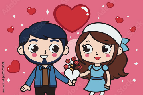 Cute Cartoon Couple Holding Hands with Hearts for Valentine's Day