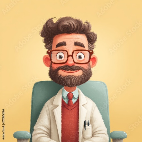 Cute cartoon doctor character with beard and glasses smiling while sitting on teal chair wearing white coat and red vest