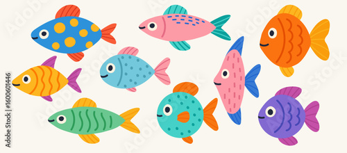 Cute cartoon fish collection, colorful tropical aquarium animals, hand drawn sea life set, funny vector illustration, playful marine creatures, vibrant underwater design, kids ocean art, decorative