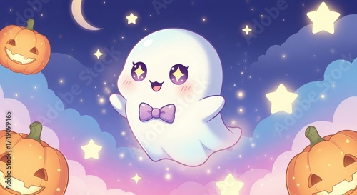 ghost, cute, cartoon, halloween, adorable, skittish, character, fun, smile, night, star, pumpkin, moon, pastel, cloud, playful, fantasy, wallpaper, illustration, digital, art, design, friendly, charming, happy, joyful, sky, magical, bright, colourful, sweet, festive, october, trick or treat
